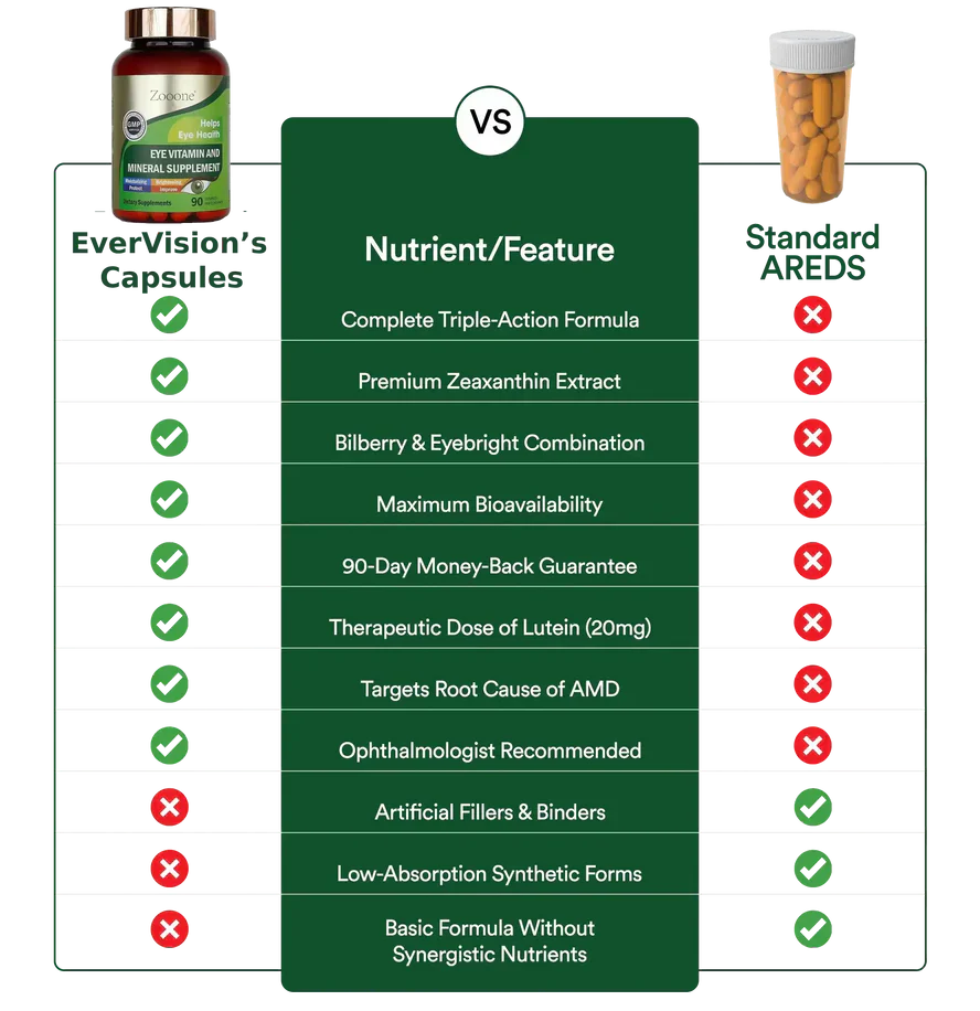 EverVision's Zoone replenishes the eye's natural macular pigment (your internal "sunglasses") that blocks harmful blue light and free radicals. This yellow protective shield in your macula gradually rebuilds, strengthening your first line of defense against AMD.